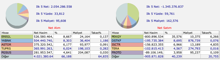 Günün en dikkat çeken işlemlerinden biri de ABD merkezli yatırım bankası Bank of America'nın (BofA) gerçekleştirdiği hacim bazlı alım ve satışlar oldu. Bankanın gün içinde en fazla alım ve satım yaptığı hisseler şu şekilde sıralandı: