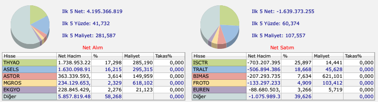 Günün en dikkat çeken işlemlerinden biri de ABD merkezli yatırım bankası Bank of America'nın (BofA) gerçekleştirdiği hacim bazlı alım ve satışlar oldu. Bankanın gün içinde en fazla alım ve satım yaptığı hisseler şu şekilde sıralandı: