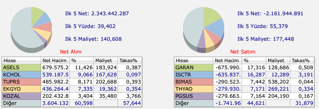 Günün en dikkat çeken işlemlerinden biri de ABD merkezli yatırım bankası Bank of America'nın (BofA) gerçekleştirdiği hacim bazlı alım ve satışlar oldu. Bankanın gün içinde en fazla alım ve satım yaptığı hisseler şu şekilde sıralandı: