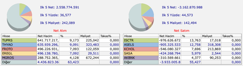 Günün en dikkat çeken işlemlerinden biri de ABD merkezli yatırım bankası Bank of America'nın (BofA) gerçekleştirdiği hacim bazlı alım ve satışlar oldu. Bankanın gün içinde en fazla alım ve satım yaptığı hisseler şu şekilde sıralandı:
