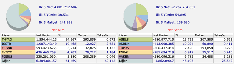Günün en dikkat çeken işlemlerinden biri de ABD merkezli yatırım bankası Bank of America'nın (BofA) gerçekleştirdiği hacim bazlı alım ve satışlar oldu. Bankanın gün içinde en fazla alım ve satım yaptığı hisseler şu şekilde sıralandı: