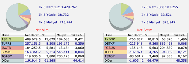 Günün en dikkat çeken işlemlerinden biri de ABD merkezli yatırım bankası Bank of America'nın (BofA) gerçekleştirdiği hacim bazlı alım ve satışlar oldu. Bankanın gün içinde en fazla alım ve satım yaptığı hisseler şu şekilde sıralandı: