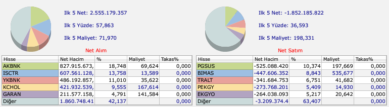 Günün en dikkat çeken işlemlerinden biri de ABD merkezli yatırım bankası Bank of America'nın (BofA) gerçekleştirdiği hacim bazlı alım ve satışlar oldu. Bankanın gün içinde en fazla alım ve satım yaptığı hisseler şu şekilde sıralandı: