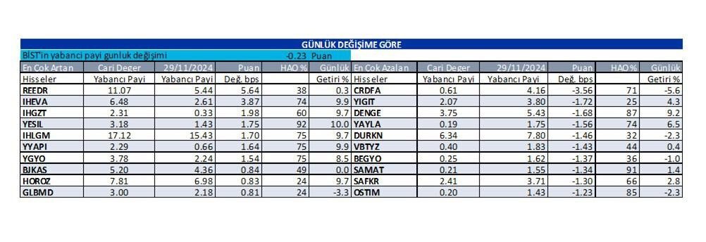 "Bugün çıkan raporumuzda, günlük bazda yabancı oranı en çok artan hisseler; REEDR:5.64 bps, IHEVA:3.87 bps, IHGZT:1.98 bps, iken, azalan hisseler ise; CRDFA:-3.56 bps, YIGIT:-1.72 bps, DENGE:-1.68 bps. olarak görüntülenmektedir.